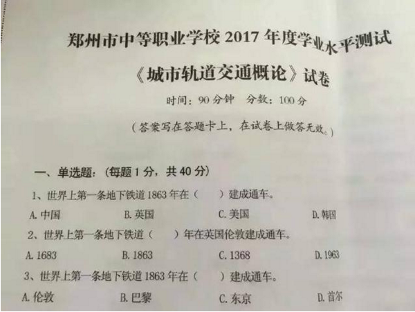 近日,一张郑州市中等职业学校的试卷连日来引发热议,这张试卷选择题的前三道源于同一个内容:“世界上第一条地下铁道1863年在英国伦敦建成通车”,区别只是抠了不同的位置作为选择题的选项。