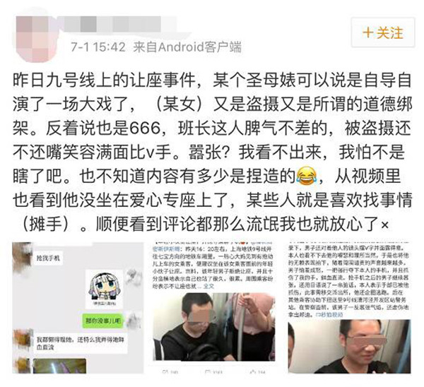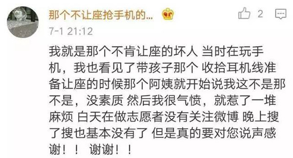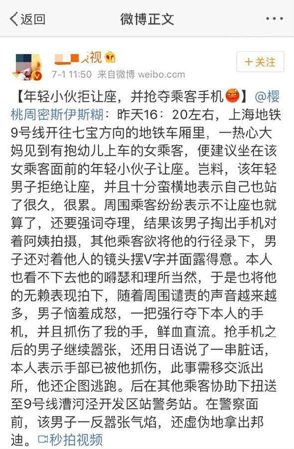 近日,有网友发帖称,上海地铁上有一年轻男子因上班太累为由,拒绝给抱小孩的妇女让座,还抢夺乘客拍摄的手机。随后,该男子回应称,原本是想让座的,但乘客再三指责让他很气愤,因此赌气不让。不久后,指控男子不让座的原微博被删除。