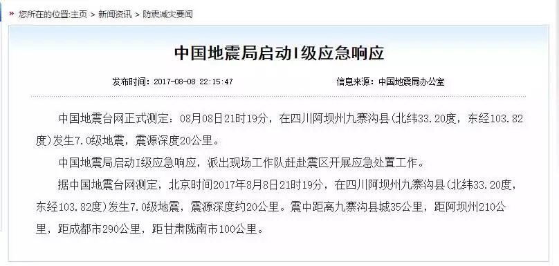 据中国地震台网中心网站消息,四川阿坝州九寨沟县,北京时间8月8日21时19分,发生7.0级地震。