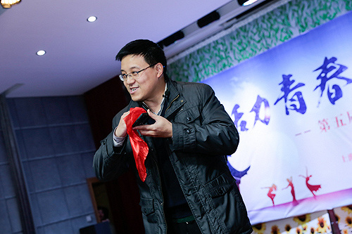 在张浩的带动下,全场的气氛被推上了高潮。接下来是徐正华老师为我们带来的魔术表演,老师与台下的同学进行了一番有趣的互动。随后老师请一位同学上台做他的小助手,只见老师拿着一块红布,在屏幕上来回的摩擦。唰的一下,手机突然不翼而飞,同学们被这神奇的一幕惊的目瞪口呆,全场响起了热烈的掌声。