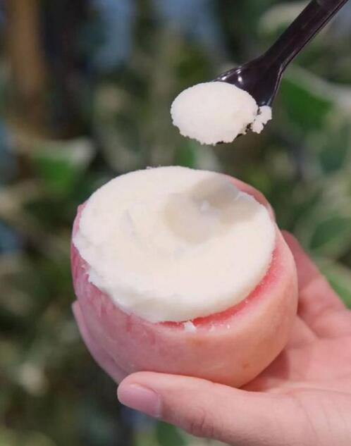 网红冰淇淋,果然骨骼清奇,有水蜜桃和火龙果两种口味,水蜜桃冰淇淋,外表就是一个完整粉嫩的水蜜桃,外面果肉很硬,中间是塞得满满的桃子果泥冰淇淋。