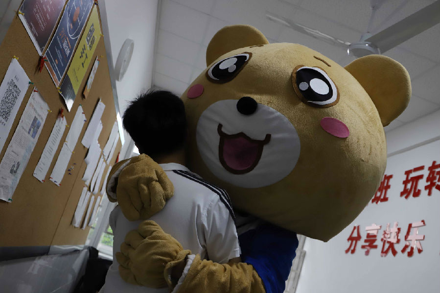 小明走到教室前熊熊熊突然出现。熊熊熊一边说一边张开手臂去拥抱小明,小明双手张开去迎合他们的拥抱。