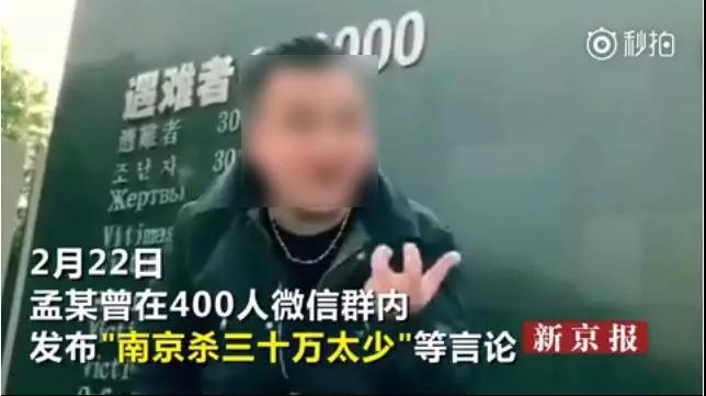 中国人里也不乏这样的无知~~今年2月,35岁男子孟某因在微信群中与其他网友发生口角,随后在群中发布了关于南京大屠杀的相关言论,其中“南京杀三十万太少”引起中众多网友的不满。随后,该男子被警方行政拘留5天。但没想到的是,获释之后的男子并没有对自己的行为有所悔悟,而是在南京大屠杀纪念碑前面做起了直播,表示自己不光要录视频骂,还要直播继续骂人。