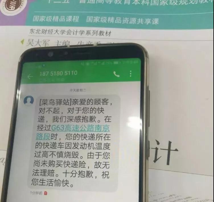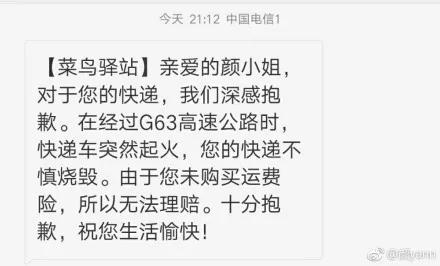 内容写着“在经过G63高速公路南京路段时,您的快递所在的快递车因发动机温度过高不慎烧毁,由于您尚未购买快递险,故无法理赔。”