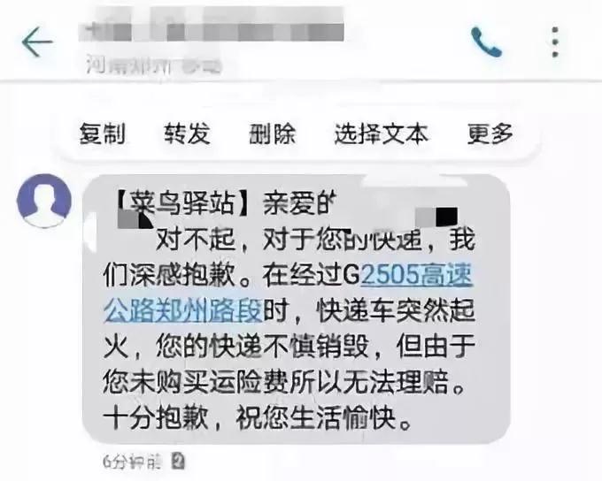 “双十一”过后,消费者迎来一波收快递高峰。然而,11月13日,不少小伙伴们手机收到一条署名为“菜鸟驿站”,称“快递车在高速路上被烧毁,快递无法送达”的短信,