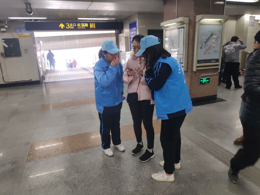 渐渐的,大家开始自信的回答行人的提问;一言不发的“标兵”也开始喊出口号,提醒行人注意安全;站在进站口的男生不再犹豫,而是主动帮忙把大件行李放上安检台。紧张的气氛逐渐消散,嘈杂的地铁站里,总能听见夸奖和道谢。