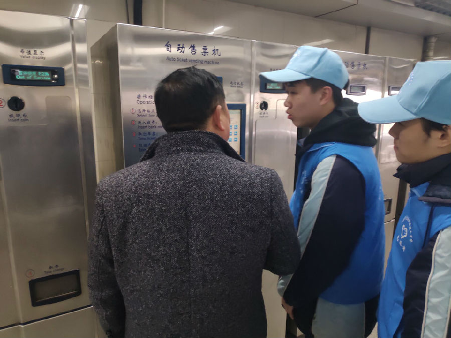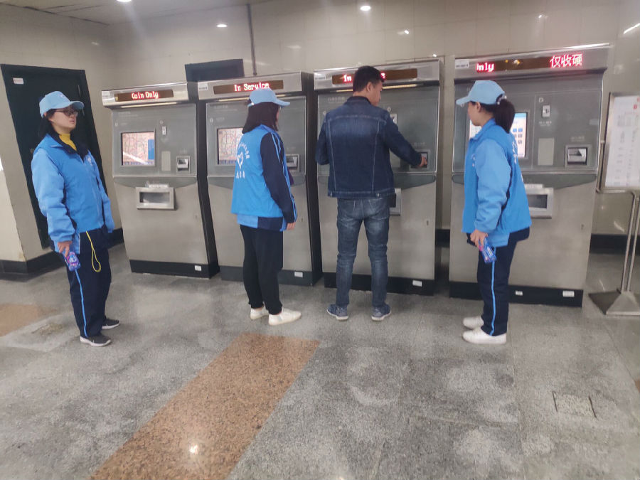 来往的乘客看到各位同学热情地为需要帮助的人提供服务后,都会笑着竖起大拇指,或是“加油”的动作,这些使大家觉得我们的付出是有意义的、是被很多人所认可的,这是无形之中的添油助力,也使同学们的状态渐渐进入了佳境。更是有许多接受了帮助的路人和我们一起拍照留念。