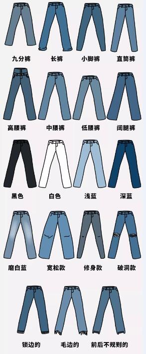 买了上衣,得有裤子配吧,牛仔裤就有这么多种……