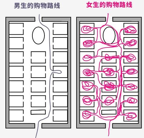 所以同样是出门买衣服,男女生逛商场的路线分别是这样的: