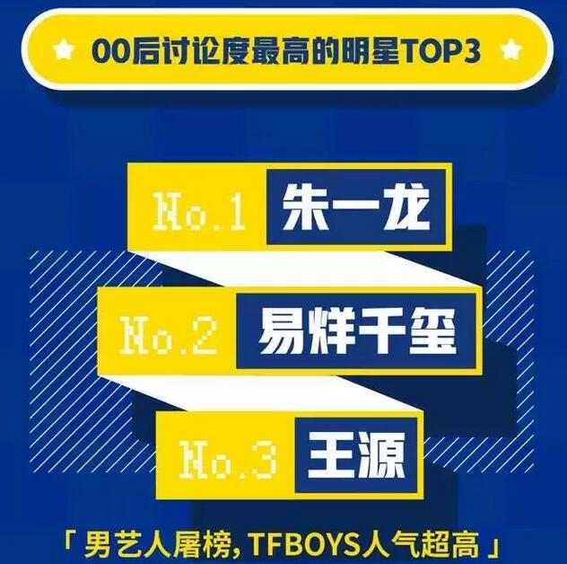 00后讨论度最高的三位明星则遭到男艺人“屠榜”,朱一龙、易烊千玺和王源分列第一至三名。