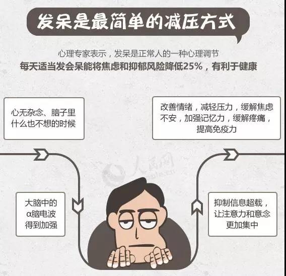 而人在发呆的时候,人脑意识活动减弱,处于一种清醒而放松的状态,是很好的精神调剂手段。