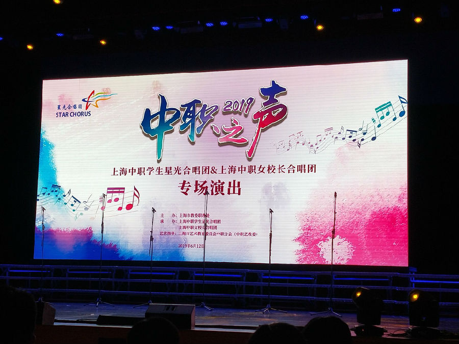 6月12日的晚上7点,在徐汇区青少年活动中心剧场中,“中职之声”专场演出,由上海中职学生星光合唱团与上海中职女校长合唱团合作为我们带来演出。在此场演唱会中,除了由《我和我的祖国》《国家》等爱国歌曲;也有《YOU Raise Me Up》《红红的玫瑰》等经典老歌;更有《来日之歌》《大鱼》等流行歌曲。给人带来的感官体验是前所未有的雄伟壮观。