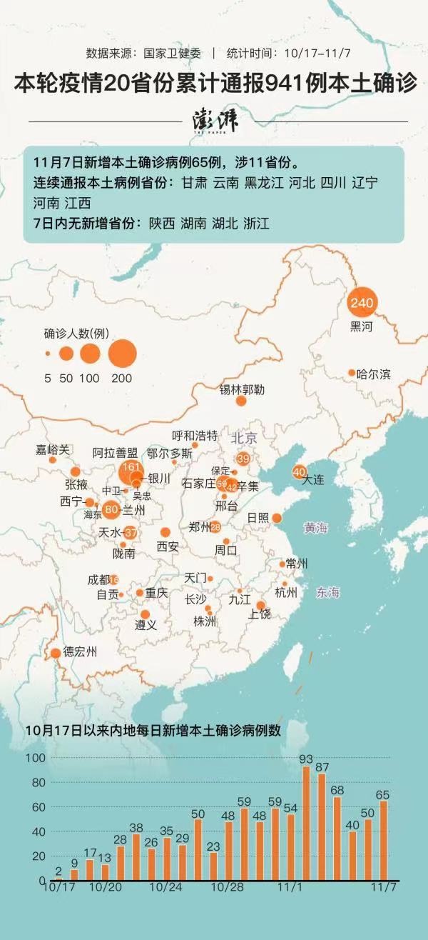 11月7日0—24时,中国内地新增本土确诊病例65例,涉及11省份。至此, 10月17日以来已累计本土确诊病例941例。本轮疫情波及20个省份,本土确诊病例最多的为黑龙江(245例),其次为内蒙古(183例)、甘肃(140例)。最近几日,前述3省份防控效果正在逐步显现,每日新增确诊病例均降至个位数。