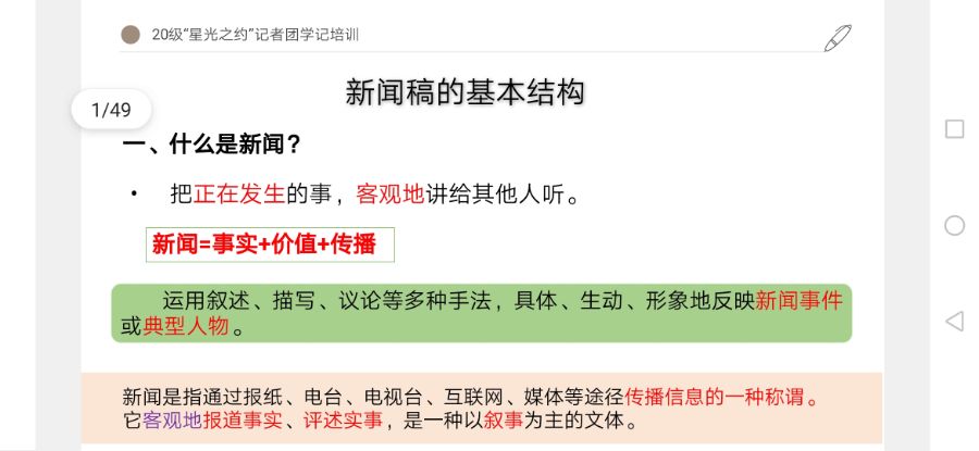 会议开始,张诗祺简要的说明了会议要讲的内容,后详细说明了什么是新闻,新闻稿的基本结构以及写作中常见的问题等。