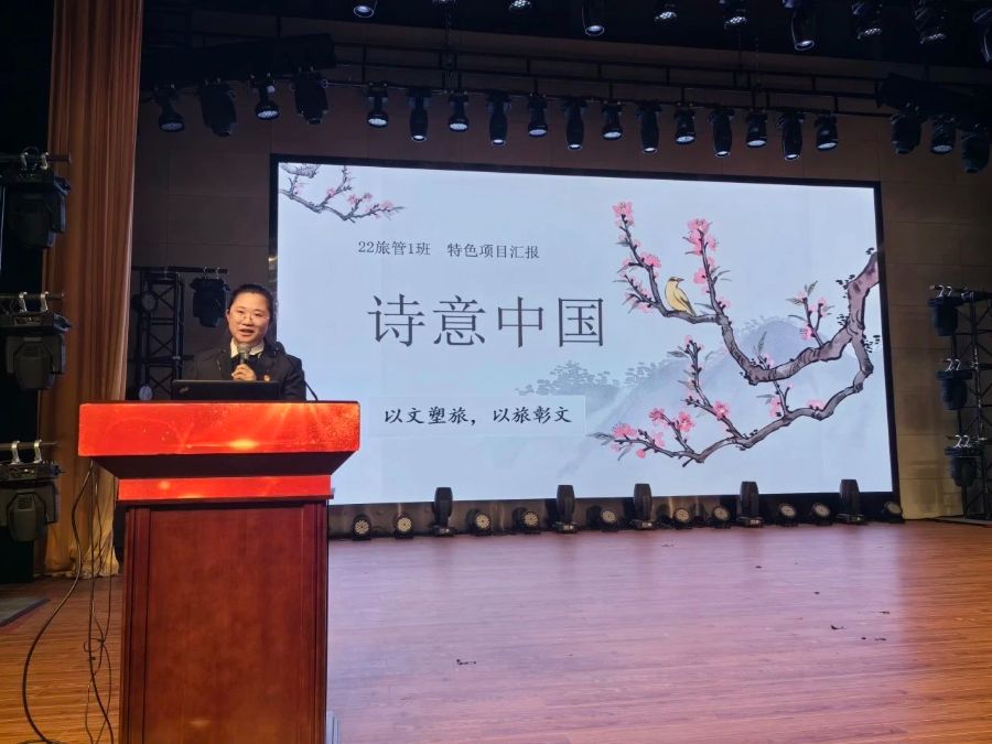 “诗意中国”是22旅管1班的班级特色项目,此项目结合当前文旅融合大背景,同学们通过阅读、朗读、诵读和品读,通过一首诗、一本书走进一座城,从一座城背后的文化积淀到整个中华文明的文化内涵,为大家打开了一幅历史画卷的同时,让我们博览全国各地著名文化景点,又让学生树立了文化自信,引导学生扎根中国大地,讲好中国故事。