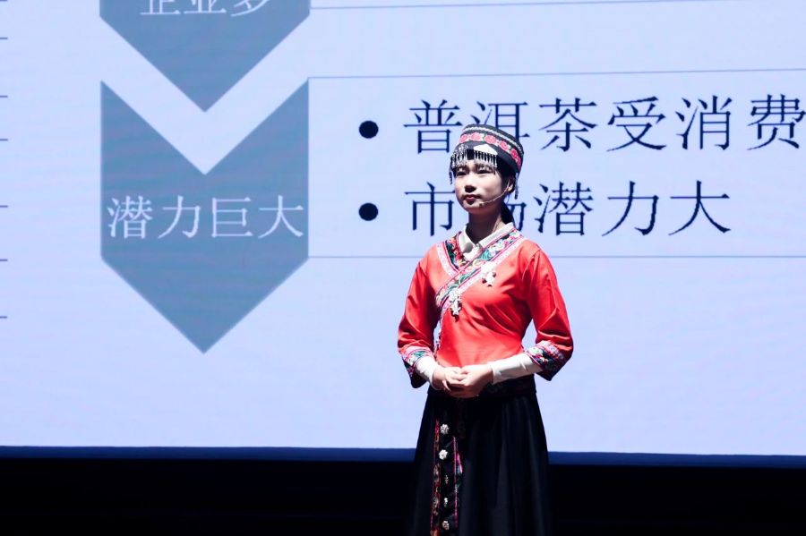 技能大赛获奖学生代表以TED演讲“精彩中华讲述人”的形式展现了商旅学子逐梦前行、砥砺奋进的自信和力量。创业路演《茶马元界》则展示了同学们将传统文化元素融入创新创业项目的初步成果。