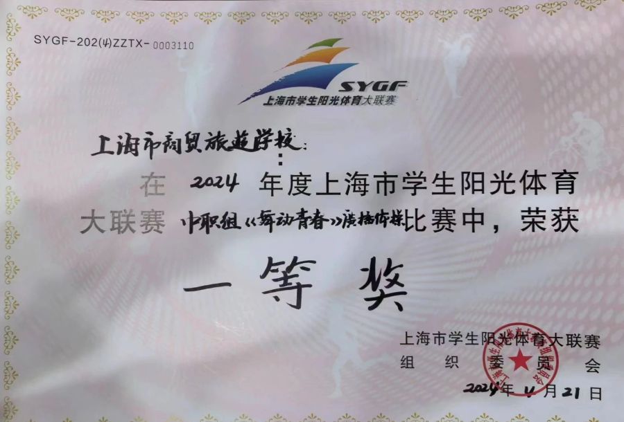 4月21日,2024年上海市学生阳光体育大联赛中职组广播操比赛在上海市商业学校体育馆拉开帷幕。我校52名学生参赛,获得《舞动青春》广播体操比赛一等奖。