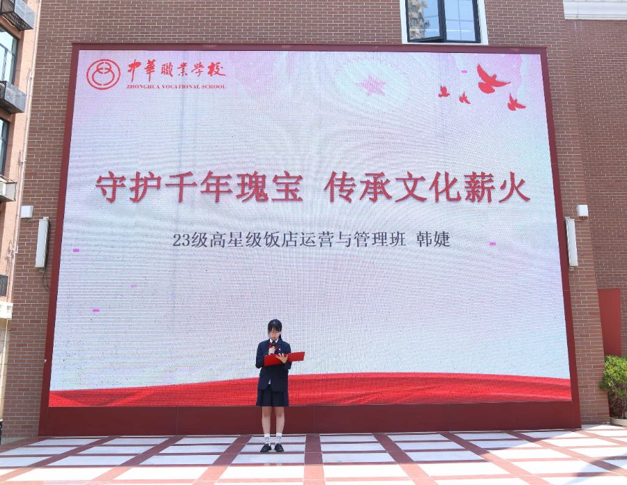 23级高星级饭店运营与管理班的韩婕同学作为学生代表,发表了题为《守护千年瑰宝,传承文化薪火》的演讲。她从自身专业出发,结合中华传统礼仪文化与现代服务业的发展,呼吁同学们关注文化遗产的保护与传承。