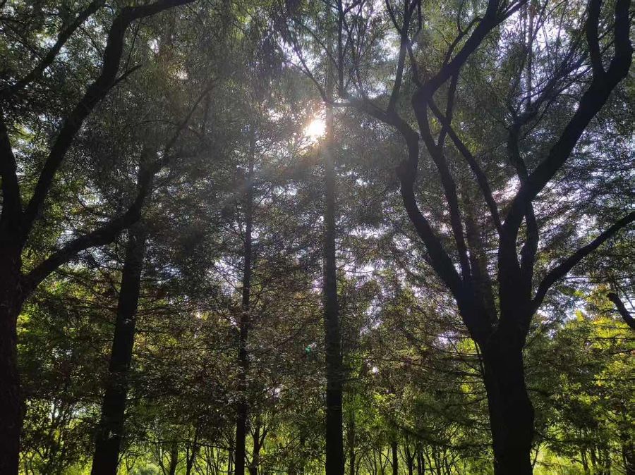 抬头望向这片树林,阳光如细碎的金箔,从层层叠叠的枝叶间筛落下来。高大的树木伸展着遒劲的枝干,像是无数墨绿色的手臂,在天空下交织成一张深邃的网。每一片叶子都被阳光镀上了亮边,随着微风轻轻晃动,沙沙的声响在林间悠悠回荡,那是自然最温柔的絮语。