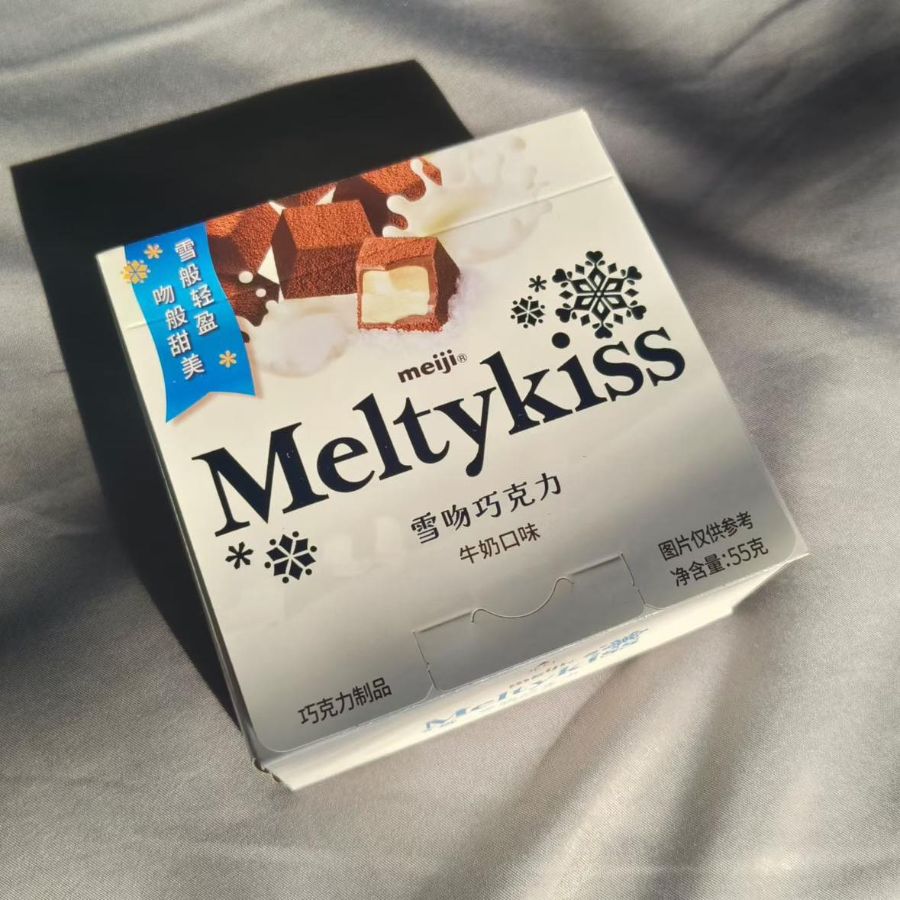 冬日的午后,阳光透过纱帘洒在床品上,一盒明治雪吻巧克力静静躺在浅灰色的布料上,成了慵懒时光里最甜的点缀。指尖抚过银白的包装盒,“Meltykiss”的字样带着雪花纹样,像把冬日的浪漫都凝在了这方小盒里,“雪般轻盈,吻般甜美”的标语,光是看着就忍不住心头一软。
