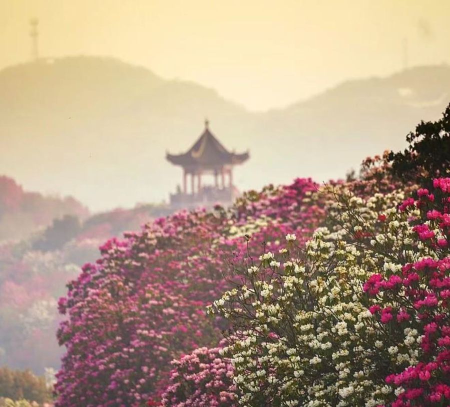 横跨毕节大方县与黔西市的这片原生杜鹃林,享有地球彩带、世界花园”的美誉,更是全球面积最广、种类最繁、保存最完整的天然杜鹃林之一。群山筑成壮丽舞台,云雾缭绕似天然幕布,数十种野生杜鹃在此竞相绽放,花色从绯红到素白、从深紫到明黄各异,一山呈现不同色彩,一树绽放不同花朵,美不胜收。