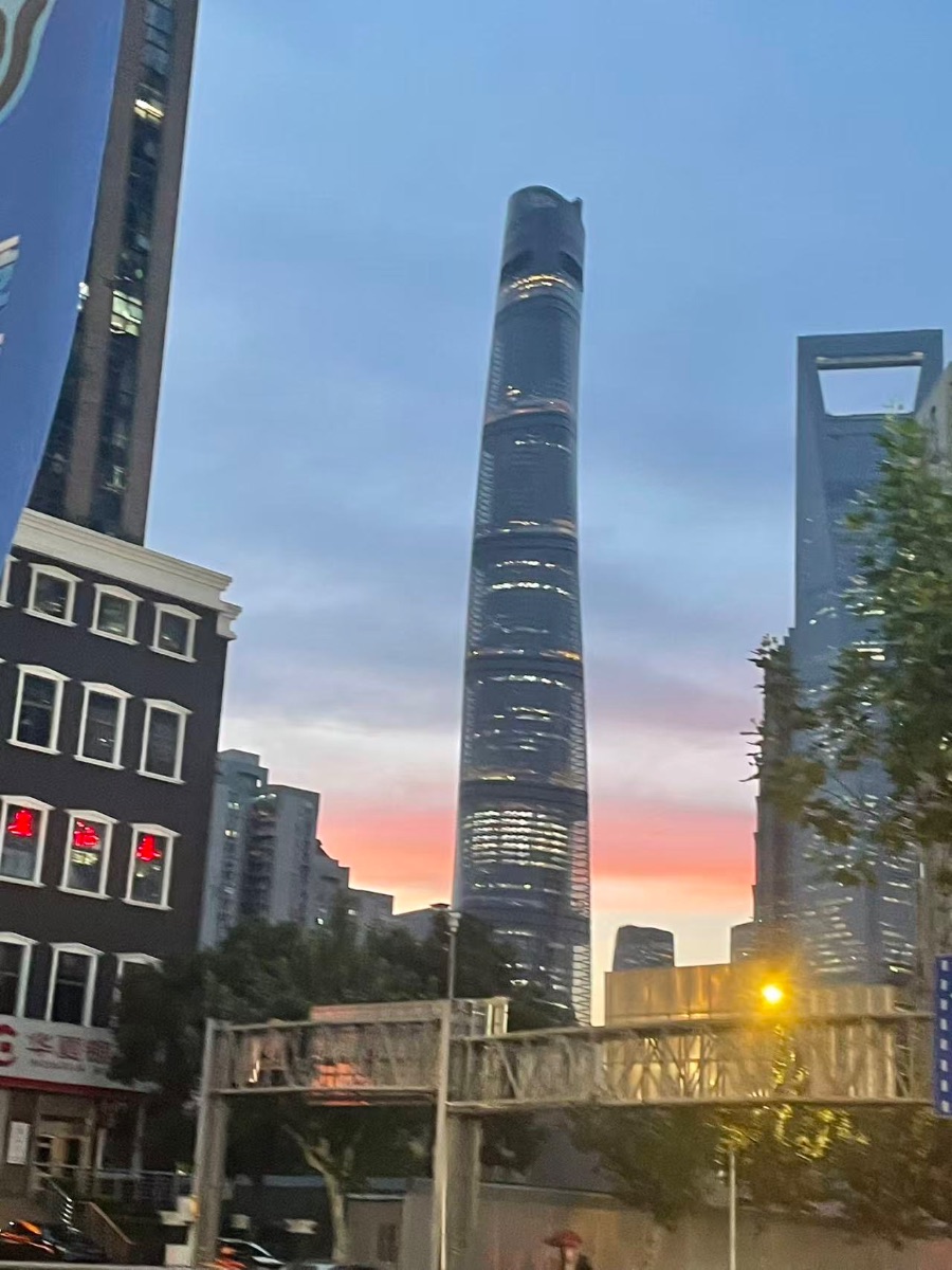 黄昏把天空晕成温柔的渐变,从澄澈的浅蓝过渡到暖融融的粉橙,上海中心大厦便在这暮色里拔地而起,成为城市天际线最醒目的注脚。