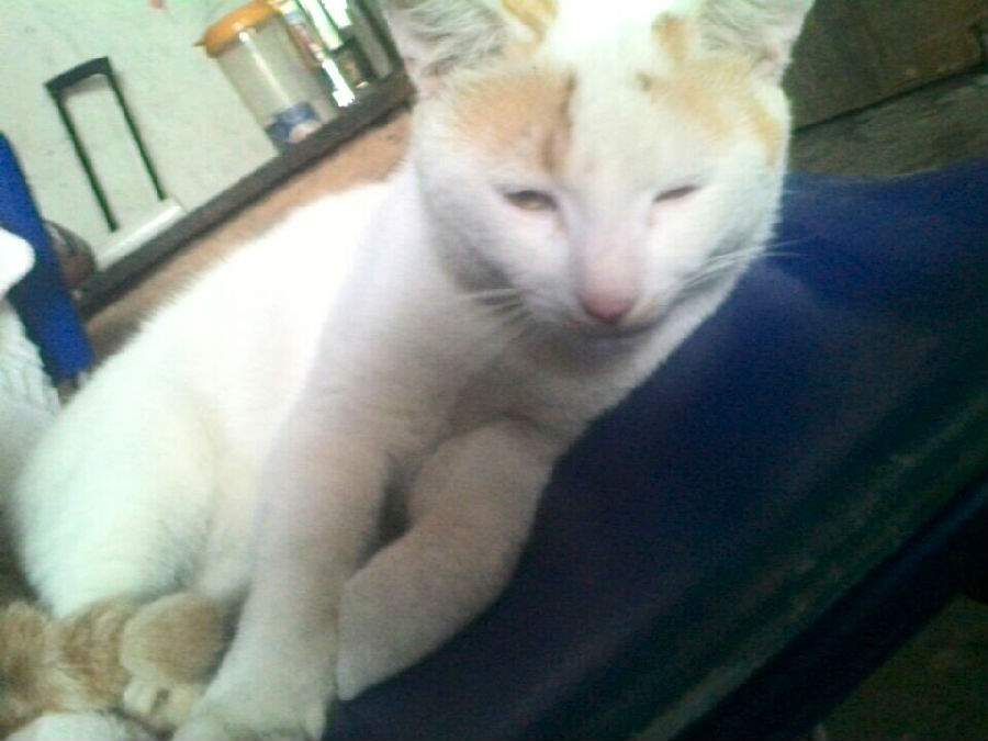 我家有一只很顽皮的喵星人。它全身都是白色的毛,头上长着两只淡黄色小耳朵,有一双圆溜溜的眼睛,还有敏捷的四肢。
