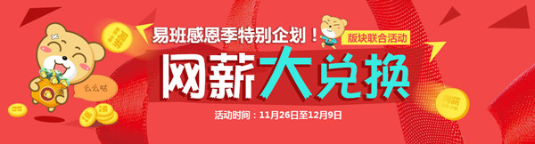 大家期待已久的【易班感恩季特别企划】第二弹!网薪大兑换!正式上线啦~!即日起至12月9日,凡参与本次版块联合活动,赢取网薪奖励和兑换基础易积分, 12月10-15日期间,大家就可凭获得的易积分和账号内网薪兑换喜欢的奖品啦~